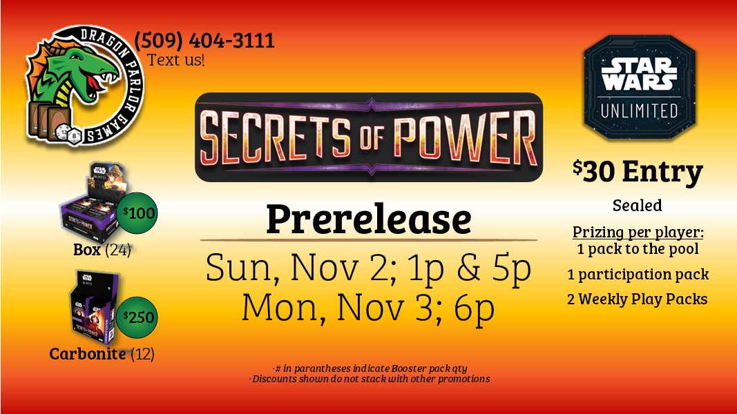 $30 Entry: Includes your Prerelease kit, each player receives an additional participation pack for playing as well as 2 Weekly Play packs. Each entry also adds 1 pack to the prize pool.