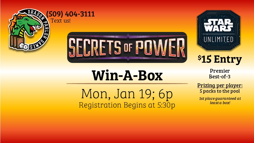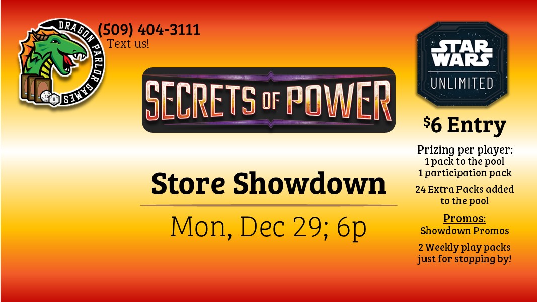 Join us for the Secrets of Power Store Showdown! Format: Premier Format Casual REL Best of 3 games Swiss Pairings Prizing & Entry: $6 Entry 2 packs per player added to the prize pool See you at the Parlor!